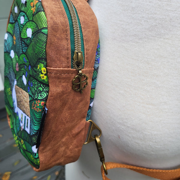 Specs: the finished pack is approximately 6” wide by 7 1/2” tall and is 2 1/2” deep. The shoulder strap is cut to 56” long.